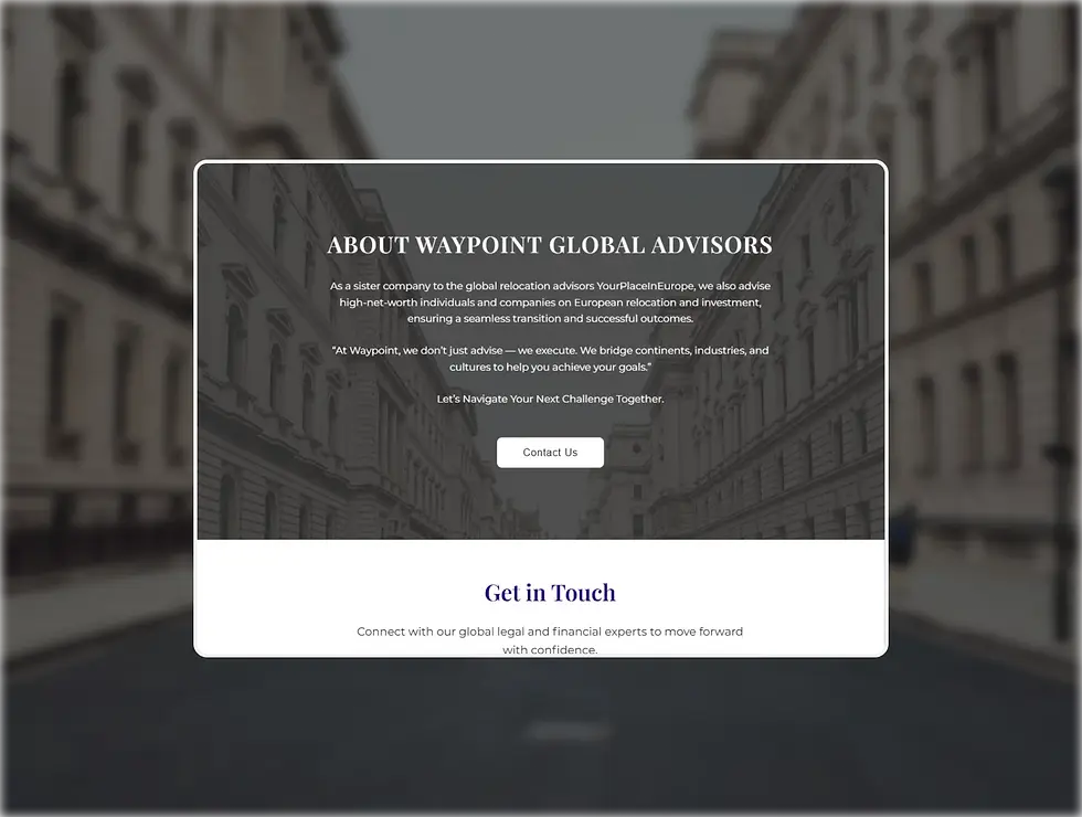 I designed and built this corporate consulting website in Wix from scratch for Waypoint Global Advisors, a firm specializing in legal, financial, and tech advisory services. The result is a structured, professional digital presence that communicates global expertise, strengthens credibility, and guides prospective clients toward consultation requests – designed and built in Wix to support business growth and lead generation.